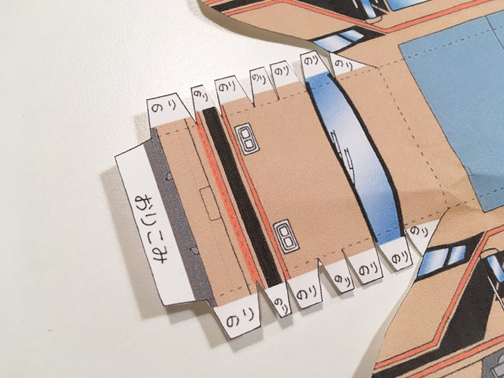 車輪部分の底は閉じられておらず、左右両側の紙一枚ずつで車体を支えているため、平面で車体を支えるタイプのペーパークラフトよりやや壊れやすいかもしれません。